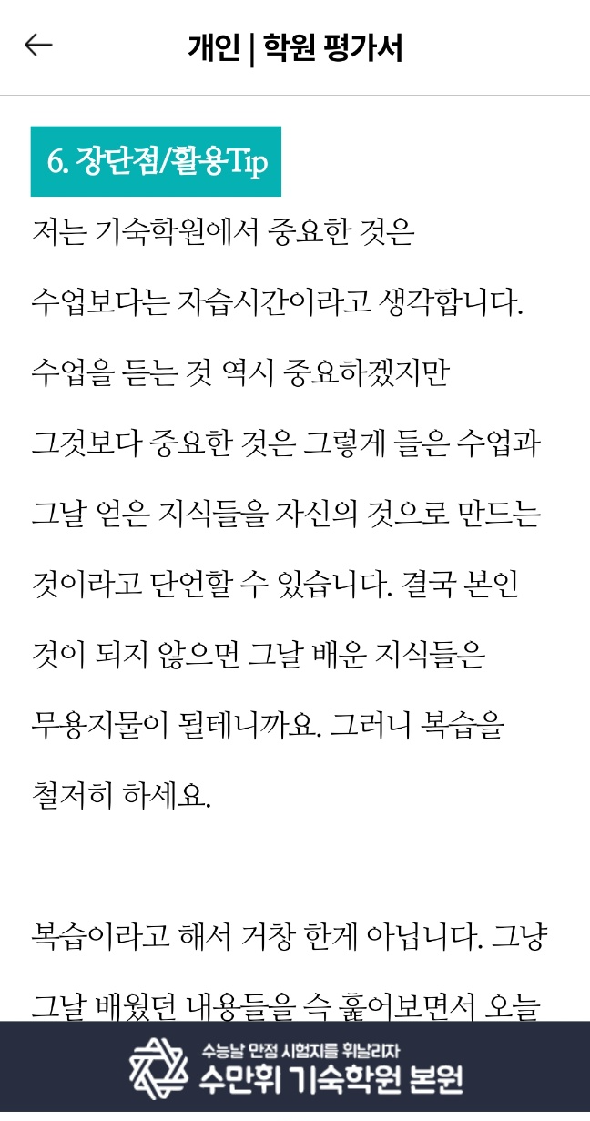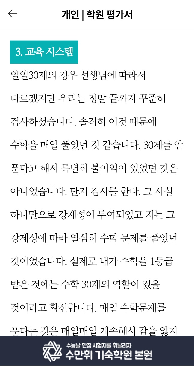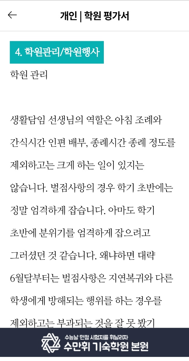 이 학생은 2번째 반이었네요. 흔히 말하는 팀플반. 본인 반은 분위기가 좋았기 때문에 특별히 관리가 필요하지 않은 정도였다고 서술했습니다. 다만 하위반의 경우는 성적대가 낮은 학생들 중 남녀대화나 쪽지를 주고 받는 경우가 있어서 이 부분은 때때마다 모두 근신에 처해졌다고 합니다. 이 관리는 처음부터 끝까지 엄격하게 이루어진다고 하는 걸로 봐서 생활관리는 엄격하다 말할 수 있겠습니다. 결과론적으로 보면 학원측의 관리도 중요하지만 어떤 학생들이 있는가 하는게 그에 못지 않게 중요합니다. 결국 반 분위기는 학생들 자신이 만들어 가는거니까요. 그래서 기숙학원에 들어가라도 되도록 상위반으로 가려 하는 것이겠죠.