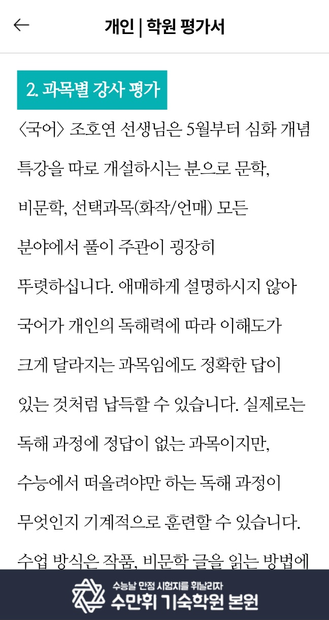 이번 평가서에서는 학생의 강사평이 구체적이진 않았습니다. 워낙 다른 학생들이 구체적으로 썼기 때문에 상대적인 것도 있겠지만 제가 9점으로 평한 강사 중 8.5점 정도를 줄 수도 있을 것 같은 평가들이 있었습니다. 허나 일반적인 경우로 봤을 때는 9점을 부여해도 무리가 있진 않다는 생각에 이렇게 평가하였고요, 강남하이퍼기숙학원 의대관 학생 중 다른 한 명도 이와 비슷한 평이어서 문제될 것은 없다고 판단했습니다.