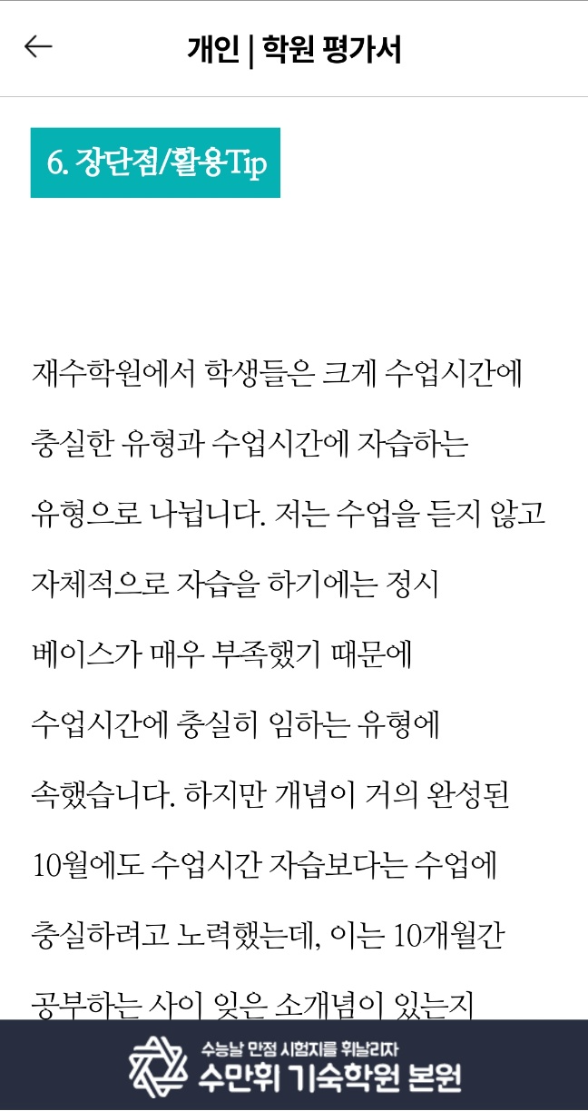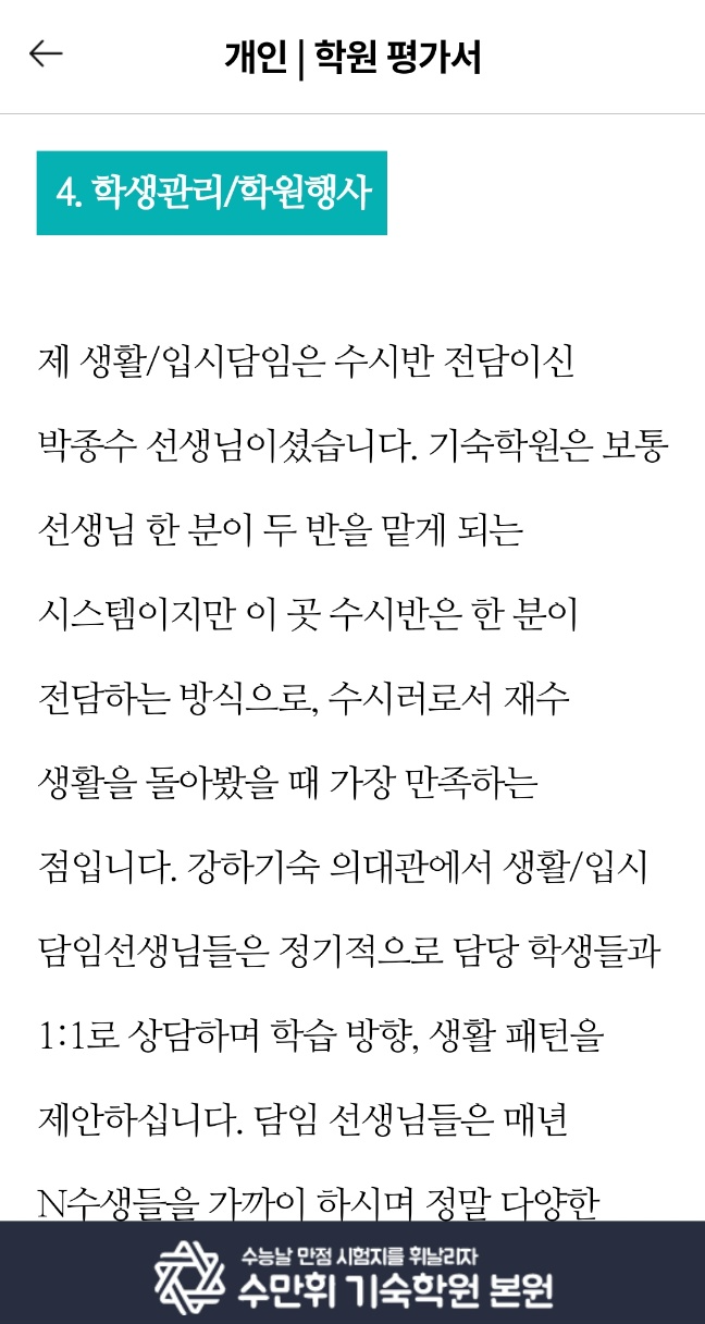 확실히 저도 평가서를 읽으면서 느끼는 것인데, 선택수업을 하는 기숙학원들은 평가가 구체적으로 나오기 힘든 것 같습니다. 예를 들어 독학기숙학원에 다닌 학생들에게 재수기숙학원 만큼 평가서 작성하라 하면 아무리 쥐어 짜내도 동일 분량은 나오기 힘든 것처럼 강사와의 연계성이 낮아지면 낮아질수록 공부이야기가 주가 되지 학원에 대한 이야기는 부차적인게 되는 것 같습니다. 생활담임에 대한 것은 다른 학원과 거의 비슷하지만 이외에는 내용이 부실합니다. 이야기할게 없어서 그럴 수도 있겠습니다. 많이 아쉬운 부분이네요. 다음에 메가스터디 러셀 기숙학원 분석할 때 다시 한 번 말씀드리겠습니다. 러셀도 강남하이퍼기숙학원 의대관과 동일한 시스템을 갖고 있으니까요.